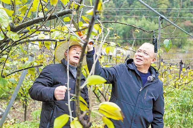 11月17日,巫山县金坪乡袁都村梨园内,来自山东烟台的秋月梨种植专家高飞虎(右)正在查看梨树。