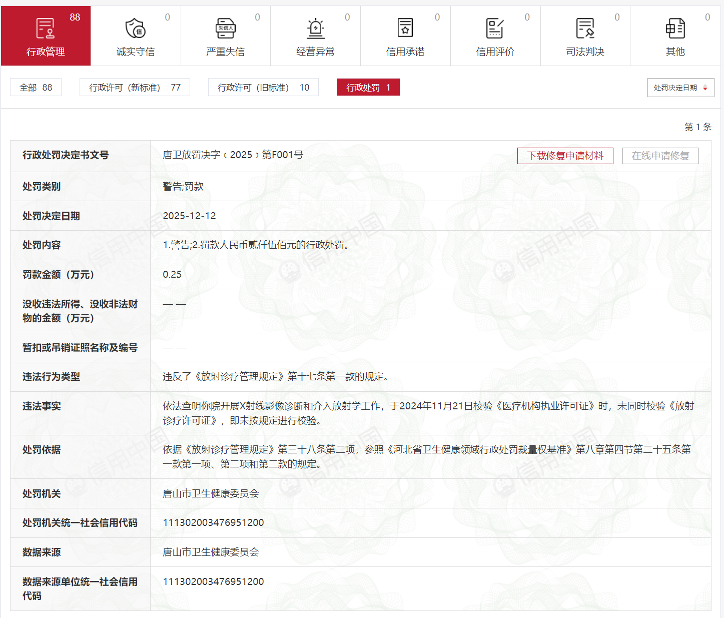 文号“唐卫放罚决字〔2025〕第F001号”行政处罚决定书显示,唐山市中医医院开展X射线影像诊断和介入放射学工作,于2024年11月21日校验《医疗机构执业许可证》时,未同时校验《放射诊疗许可证》,即未按规定进行校验。违反了《放射诊疗管理规定》第十七条第一款“《放射诊疗许可证》与《医疗机构执业许可证》同时校验,申请校验时应当提交本周期有关放射诊疗设备性能与辐射工作场所的检测报告、放射诊疗工作人员健康监护资料和工作开展情况报告”的规定。